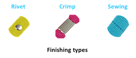 Finishing refers to the method of attaching the lanyard material. Lanyards can be sewed, riveted or clamped. The standard finishing is clamping. However, clamping is not available if you choose to attach a buckle.