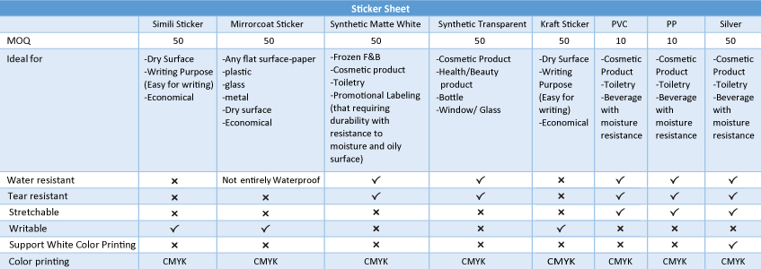 Although our sticker printing and materials may seem similar, there are different characteristics between each of them that differentiates their functionality. Simili and kraft stickers for example are not waterproof thus they are not suitable to be refrigerated, however this makes them easier to be written on as they absorb ink easily. White PE Stickers are waterproof and stretchable which allows them to be placed on food related products. If you’re looking for the right material to print, fear not, as you can refer to our table below to make the best decision for your stickers!