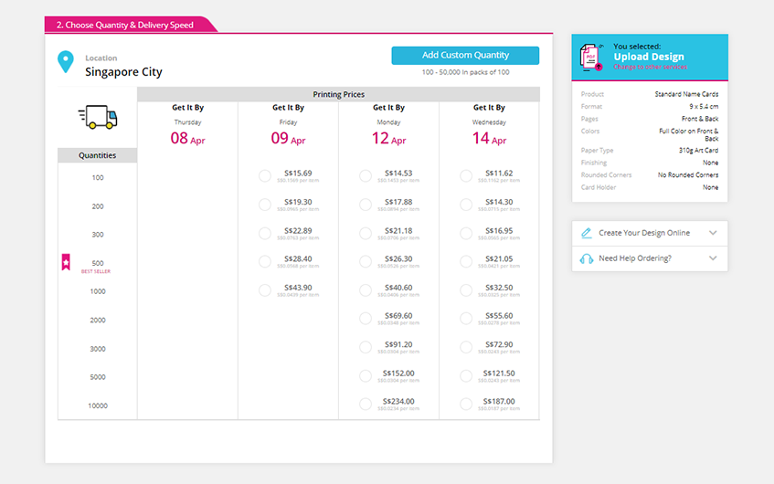 This step is pretty straightforward! If you want 200 name cards and 24hrs production, you simply click on that exact cell in the price table to add the name cards to your cart.