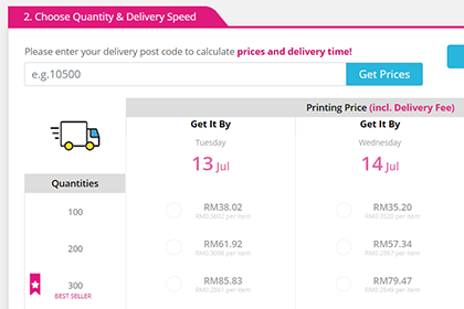 2. Select a quantity and delivery date: In the pricetable, you can choose between different quantities, as well as different expected delivery dates. Simply click the combination of quantity and delivery date that you would like to order. Clicking the pricetable allows to add the product to your cart, where you can also apply a coupon code before checking out.